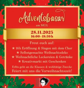 Am Freitag, den 28.11.2025 zwischen 16.00-18.30 Uhr ist das ganze MCG wie jedes Jahr in Vorweihnachtsstimmung. Unsere Klassen und Jahrgangsstufen präsentieren selbstgebastelte Weihnachtsdeko sowie weihnachtliche Leckereien und Getränke. Der Verein der Freunde stellt den Weihnachtsbaum auf und präsentiert sich mit Punsch und Glühwein.